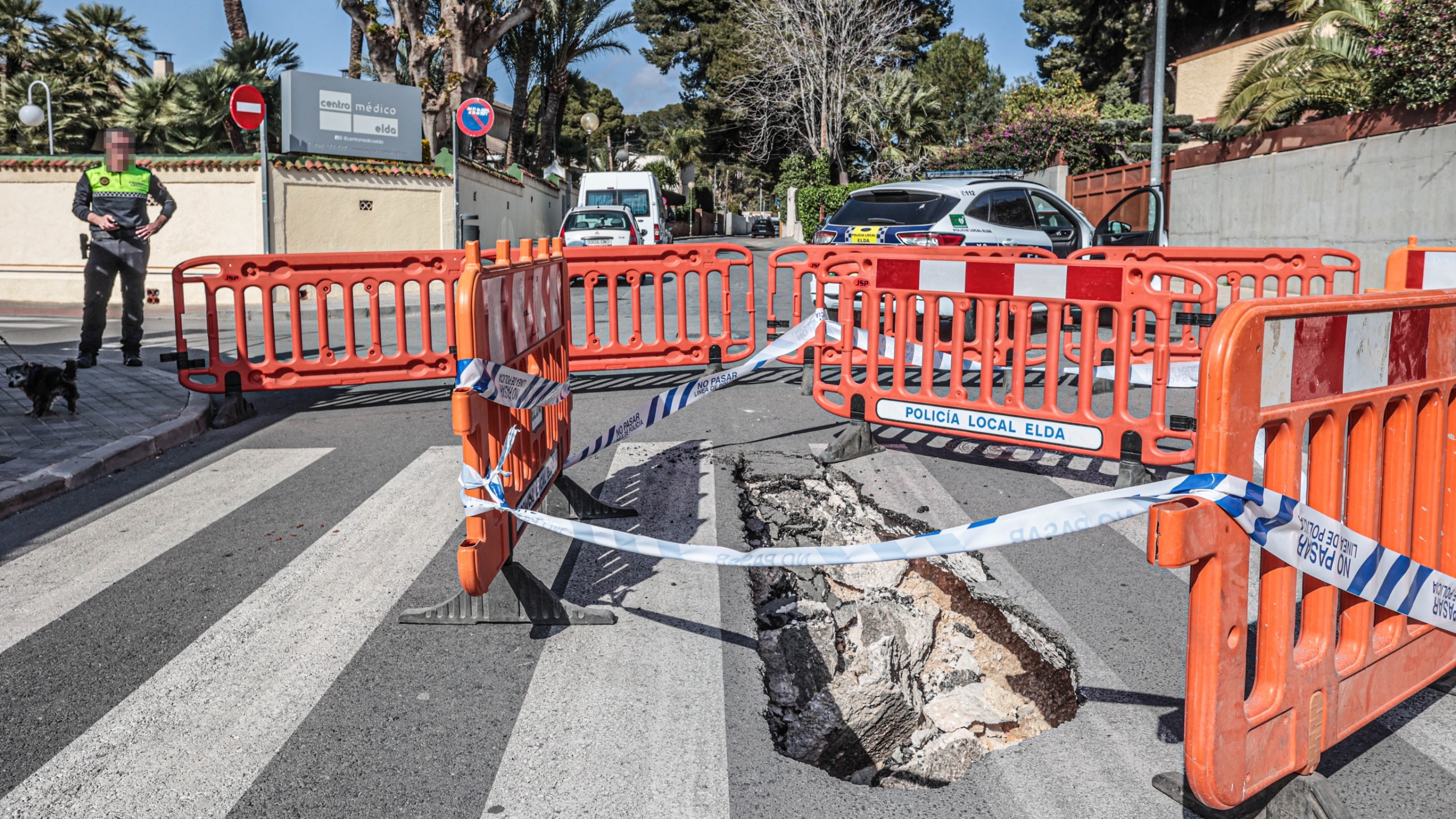 Parte del asfalto de la calle Isaac Peral de Elda se ha hundido tras el paso de un camión grúa, provocando un socavón que ha obligado a la Policía Local a cortar el tráfico para garantizar la seguridad. Los agentes se han desplazado al lugar de forma inmediata para controlar la situación.