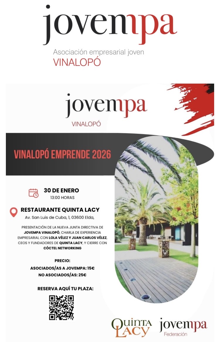 La Asociación de Jóvenes Empresarios del Vinalopó (Jovempa Vinalopó) celebrará este viernes 30 de enero, a las 13.00 h, el evento “Vinalopó Emprende 2026” en el restaurante Quinta Lacy de Elda. El encuentro incluirá la presentación de la nueva junta directiva de la asociación y una charla de experiencia empresarial a cargo de Lola y Juan Carlos Vélez, fundadores y CEOs del propio establecimiento anfitrión.